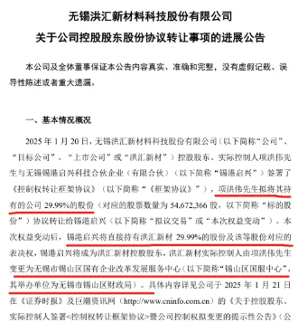近日,据无锡洪汇新材料科技股份有限公司发布《关于公司控股股东股份协议转让事项的进展公告》称:洪汇新材控股股东、实际控制人项洪伟与无锡锡港启兴科技合伙企业(有限合伙))签署了《股份转让协议》,项洪伟拟将其持有的公司29.99%的股份(对应的股票数量为54.672.366股)协议转让给锡港启兴。