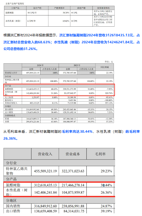 根据洪汇新材2024年年报数据显示,洪汇新材氯醋树脂的设计产能为10万吨/年,产能利用率为38.20%,水性乳液(树脂)设计产能为6万吨/年,产能利用率为65.82%。其氯醋树脂产品长期与国外企业(如德国瓦克集团、日本信越化学工业株式会社等)进行竞争之外,还不断研发拓宽产品系列及应用领域。