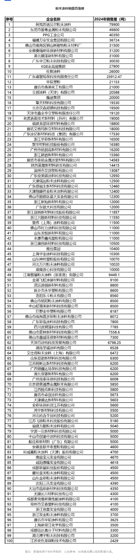 具有很强的市场竞争力。其次是东莞市爱粤金属粉末有限公司以49800吨位居第二,同比增长2%;排名第三则是PPG工业公司40350吨,同比增长1%。和2023年中国伟德客户端官网百强排行榜相比,前三名的粉末涂料企业并没有发生变化。