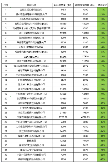福建万安、斯耐特、安徽桑瑞斯、丽泽新材料、华江粉末、KGE金高丽集团、佐敦销量分别为36724吨,31500吨、31200吨、31000吨、30030吨、27800吨、26000吨,分别排名在榜单第4~10位,其中除了KEG金高丽集团2024年销量同比下滑5%之外,其它9家企业的销量都有所增长。从排名变化上来看,相较于2023年伟德客户端官网销量100强,佐敦涂料排名从第17位跃入前十强,其销量同比增长44%。