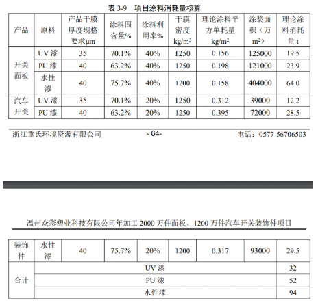 根据上表,项目理论计算溶剂漆、水性漆与企业提供的资料接近,本环评以 企业提供的涂料用量进行计算,即UV漆35t/a,PU漆55t/a,水性漆100t/a。