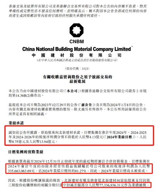 2025年3月26日晚间,中国建材发布《有关收购嘉宝莉股份之须予披露交易的最新进展》的公告称:根据相关协议,嘉宝莉承诺2024年净利润为4.13亿元,根据嘉宝莉截至2024年12月31日止财政年度的最近期经审计合并财务报表,目标集团在2024年会计年度的扣除非经常性损益后归属于母公司股东的税后净利润为人民币335.663.063.69元,占2024年业绩目标的约81.27%。因此,2024年业绩目标尚未被达成。
