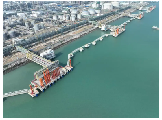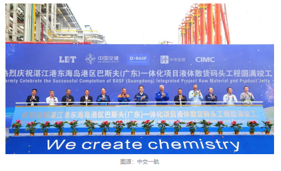 湛江港东海岛港区巴斯夫(广东)一体化项目液体散货码头工程位于广东湛江东海岛,泊位总长1469米,采用高桩墩式结构,有1个12万吨油品化工泊位、2个8万吨液化烃泊位,1个5万吨油品化工泊位。项目于2022年12月8日开工建设,2025年3月7日正式通过交工验收。