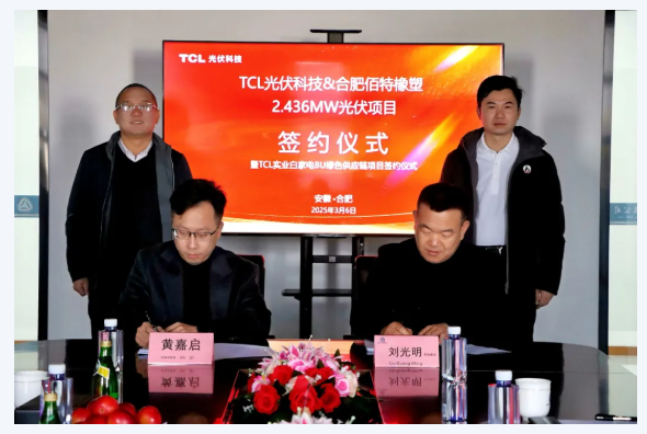 签约仪式现场,TCL白家电BU供应链管理中心总监彭军、结构采购室副经理秦超、合肥佰特橡塑佰特总经理高伟、常务副总刘光明、TCL光伏科技渠道开发部总经理黄嘉启等领导共同出席,作为TCL光伏科技首个落地的白家电供应链项目,具有重要的标杆意义,双方的绿色能源项目将迈入新阶段。