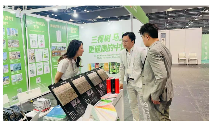 展会现场,三棵树重点展出的“绿盾防排水系统”与高性能地坪漆系列,其强大的场景适应性和可靠性备受来自香港及其它国家和地区的专业观众瞩目,与会人员共同探讨绿色建材技术在当地市场的广泛应用前景与潜在合作机遇。三棵树“绿盾”系统通过创新防排结合设计,可有效杜绝种植顶板渗漏、降低工程造价;三棵树高性能地坪漆系列凭借高强度、耐磨损、耐化学腐蚀、防静电等优异性能,已成功应用于港澳地区多个停车场、物流中心、工业厂房及公共空间。