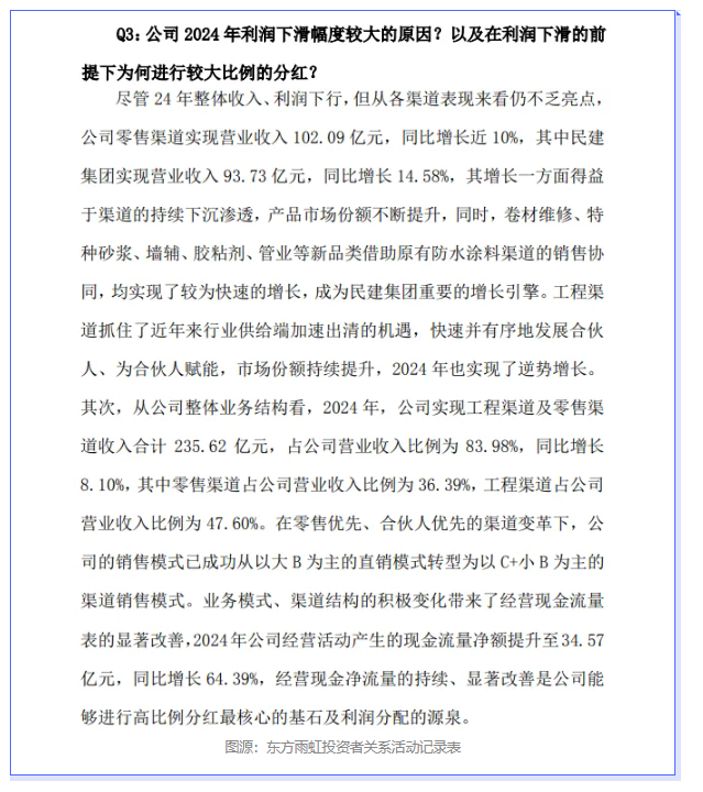 东方雨虹副总裁兼董事会秘书张蓓在近日开展的投资者关系活动中首度回应,尽管24年整体收入、利润下行,但从各渠道表现来看仍不乏亮点。公司此次现金分红方案,一是积极响应“国九条”等相关政策,二是公司过往经营过程中积累了大量的累计利润,第三,经营现金净流量的持续、显著改善是公司能够进行高比例分红最核心的基石及利润分配的源泉,是我们进行分红的底气根源。第四,公司资金状况良好,完全具备进行高比例现金分红的能力。
