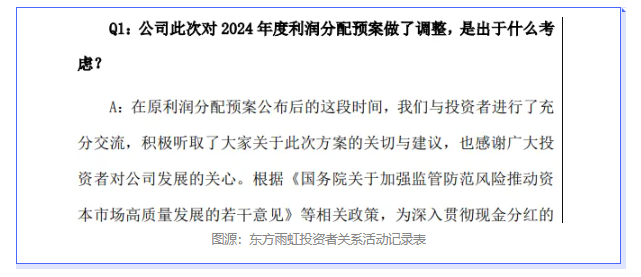 而对于2024年度利润分配预案调整一事,东方雨虹则回应道,将2024年年度分红调整为分次分红,这一决策更具备稳定性、持续性、可预期性和可实施性,能够更好地强化资金储备,使公司保持更加充裕的流动性,提升抗风险能力,提升公司偿债能力,增强应对风险的缓冲能力。公司拟将原2024年年度利润分配预案调整为分次分红,以达到年内多次分红、分期实施的目的。