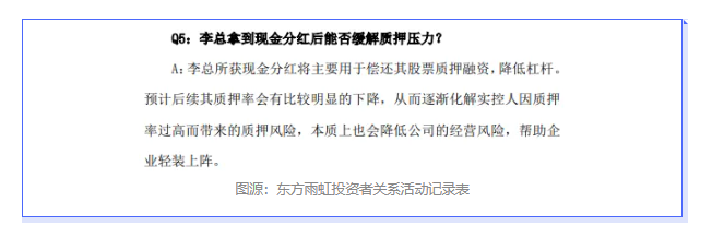虽然分红金额腰斩,但22亿仍是一个巨大的数目,这让投资者纷纷质疑老板疯狂套现捞金是否另有目的。对此,东方雨虹大方回应,称分红若顺利实施,李卫国所获现金分红将主要用于偿还其股票质押融资,降低杠杆,这样有利于降低公司经营风险。