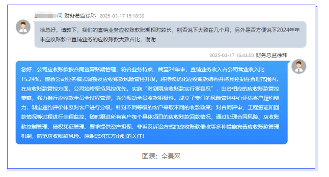 有投资者提问,直销业务应收账款账期相对较长,能否说下大致在几个月,另外是否方便说下2024年年末应收账款中直销业务的应收账款大致占比。东方雨虹回应,截至24年末,直销业务收入占公司营业收入比15.24%。在应收账款管控方面,公司始终坚持风控优先,实施“对到期应收账款实行零容忍”,对合同评审、工程签证和回款情况等过程进行全程监控,防范应收账款风险。