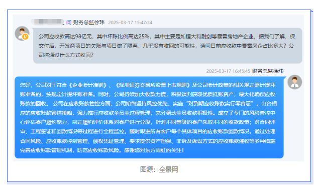 相对于能否收回问题,投资者显然更加关注坏账损失,有投资者提问,公司应收款高达98亿元,其中坏账比例高达25%,其中主要是如恒大和融创等暴雷房地产企业,保交付后,开发商项目的欠账与项目做了隔离,几乎没有收回的可能性,请问目前应收款中暴雷房企占比多大?公司将通过什么方式收回?