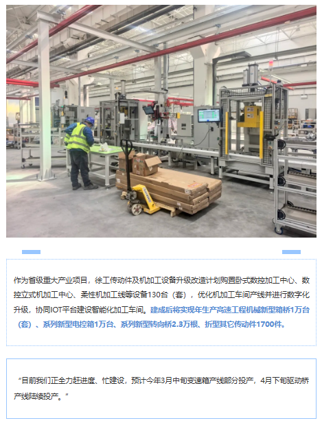 “老厂房部分设备进场,变速箱产线已经开始调试,新建厂房钢结构主体安装完成!”,走进徐工传动件及机加工设备升级改造项目的厂房内,只见工人头戴安全帽,身着工作服,正各司其职、有条不紊地完成各项工作。