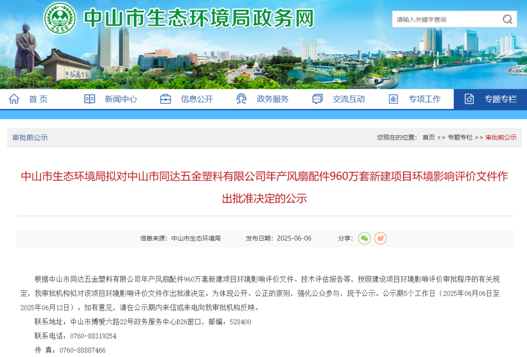 中山市生态环境局拟对中山市同达五金塑料有限公司发布年产风扇配件960万套新建项目环境影响评价文件作出批准决定的公示。根据中山市同达五金塑料有限公司年产风扇配件960万套新建项目环境影响评价文件、技术评估报告等,按照建设项目环境影响评价审批程序的有关规定,我审批机构拟对该项目环境影响评价文件作出批准决定。为体现公开、公正的原则,强化公众参与,现予公示。