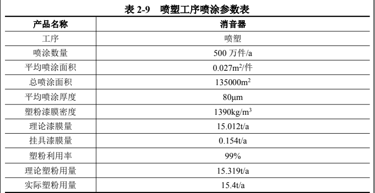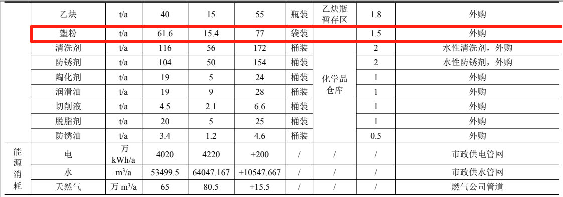 现有项目年产消音器1500万件,年用塑粉量为46.2t/a,本项目不改变产品规格和塑粉种类,年新增消音器500万件,因此年新增塑粉使用量15.4t/a。