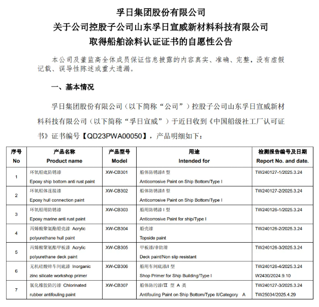 船舶涂料因其品种繁多、认证流程复杂以及测试周期较长,一直是防腐涂料难度较大的领域之一。据悉,孚日股份此次成功获得了包括环氧船底防锈漆、环氧船体连接漆、环氧船用防锈漆等在内的7款船舶涂料产品的认证。这不仅标志着其产品在性能、质量和环保等关键指标上已通过严苛检验,达到行业认可的高标准,更为公司打开船舶涂料市场大门提供了关键的“钥匙”。