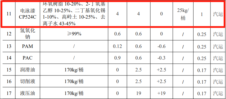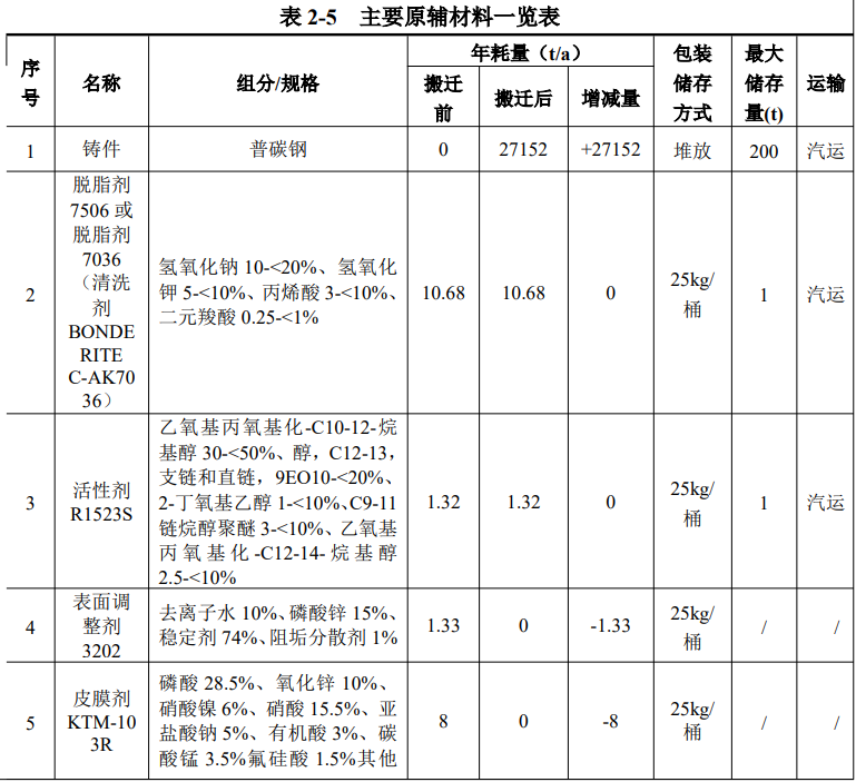 项目电泳槽配备“超滤设备”对电泳槽液进行超滤回收处理,项目电泳漆利用率约为95%,剩余的5%形成超滤滤渣和沾至挂具上电泳废渣一起按危废处置。本项目电泳漆固体分总量约为5t。则项目电泳渣产生量约为0.25t,附着在工件上的物料为4.75t。与本项目实际年用量基本相符。