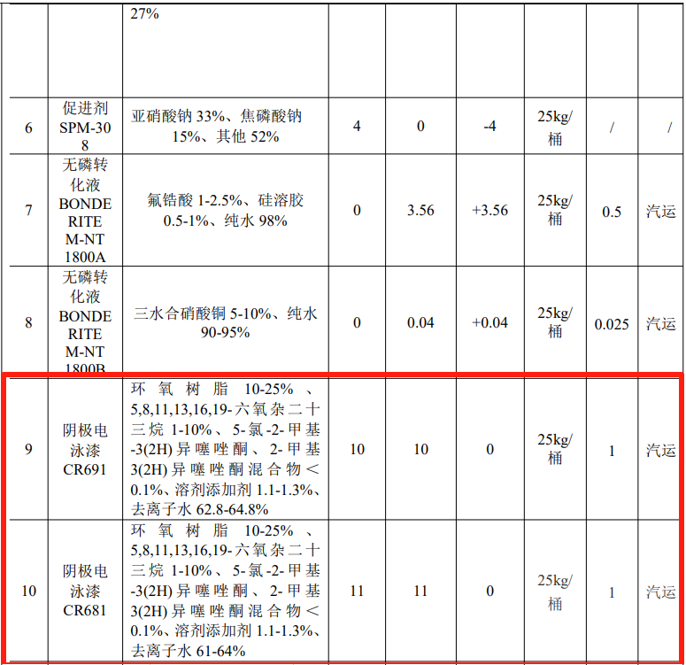 电泳漆:本项目阴极电泳漆CR691.用量为10t/a,阴极电泳漆CR681.用量为11t/a,电泳漆CP524C,用量为4t/a;电泳工序运行时将电泳漆树脂CR691/CR681与水和电泳漆CP524C进行配比;根据检测报告,去水状态下电泳漆树脂CR681和电泳漆CP524C配比后的VOC含量131g/L、电泳漆树脂CR691和电泳漆CP524C配比后的VOC含量91g/L。满足《低挥发性有机化合物涂料产品技术要求》(GB/T 38597-2020)水性涂料中车辆涂料电泳底漆限量值200g/L。