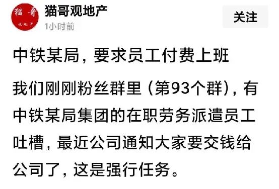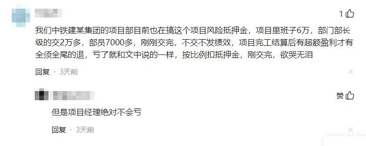 某网友还透露,中铁建某集团的项目部也在推行项目风险抵押金制度,项目班子需缴纳6万,部门部长级交2万多,部员7000多,同样存在“不交不发绩效”的情况,进一步印证了此类现象在行业内的蔓延。
