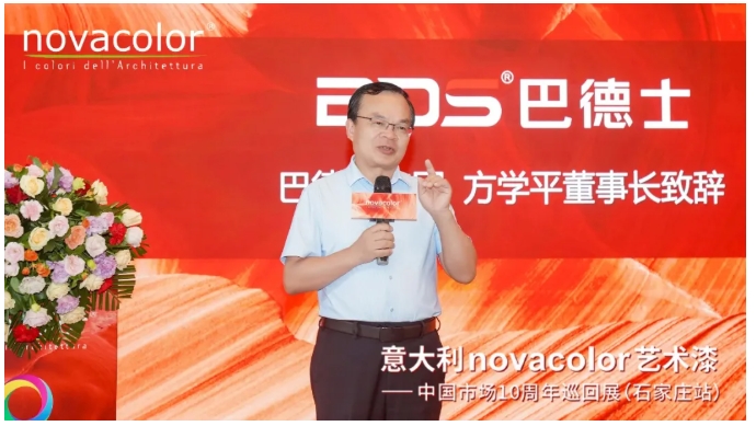 巴德士集团董事长方学平先生以充满激情的致辞为活动拉开序幕,对到场嘉宾表示热烈欢迎,并对Novacolor品牌未来的发展前景表达了坚定的信心与热切的期待。