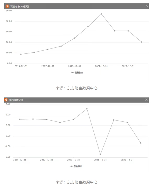 从近十年的亚士创能的营收情况来看,高峰点出现在2021年,营收为47.15亿,然而2021年亚士创能的净利润亏损5.4亿元,随后虽有上涨,但依然难逃厄运。