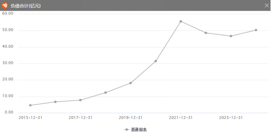 从近十年亚士创能的负债合计来看,2015年亚士创能的负债只有4.62亿元,2021年负债达到最高值,总负债55.62亿元,增长1103%,虽然自2021年之后有所下降,但在2024年也达到了50.32亿元,负债率达到79.4%,已接近80%的红色警戒线,仍处于高位。