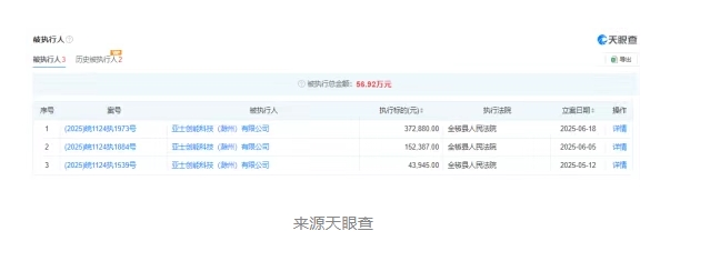 亚士创能控股的亚士创能科技(滁州)有限公司2025年5月份以来,3次被列入被执行人信息,执行标的56.92万元。