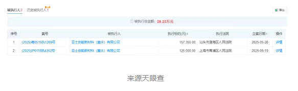 亚士创能新材料(重庆)有限公司2025年5月份以来,2次被列入被执行人名单,执行标的23.23万元。