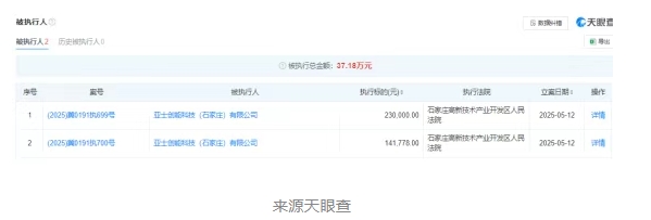 亚士创能科技(石家庄)有限公司2025年5月份以来,2次被列入被执行人名单,执行标的37.18万元。