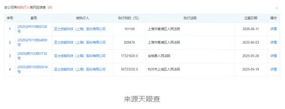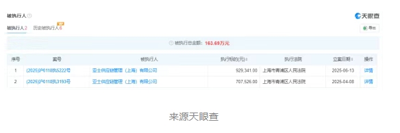 亚士创能控股的亚士供应链管理(上海)有限公司2025年5月份以来,2次被列入被执行人名单,执行标的163.69万元。