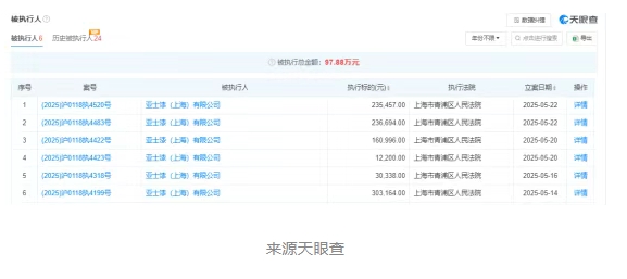 亚士漆(上海)有限公司自5月份以来,6次被列入被执行人名单,执行总标的97.88万元。