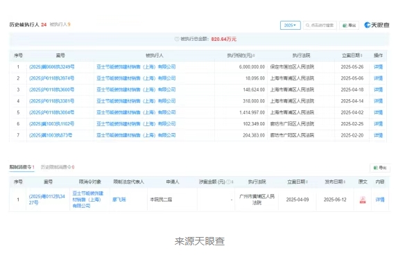 亚士节能装饰建材销售(上海)有限公司2025年以来7次被入被执行人名单,执行总标的820.64万元。其法定代表人廖飞瑶已被限制高消费。
