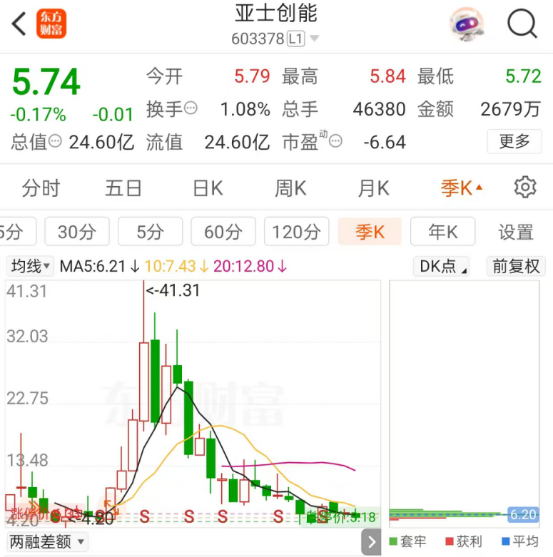 截止2025年6月20日,亚士创能的股价仅为5.74元/股,总市值也只有24.6亿元,较最高值减少143.9亿,蒸发85%。