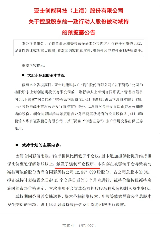 亚士创能公布,因润合同彩信用账户维持担保比例低于平仓线,且未追加担保物提升维持担保比例至追保解除线以上,触发了强制平仓程序。本次存在被强制平仓导致被动减持可能的股份为润合同彩所持公司12.857.899股股份,占公司总股本的3%。拟在减持计划披露之日起15个交易日后的3个月内进行,减持价格按照减持实施时的市场价格确定。
