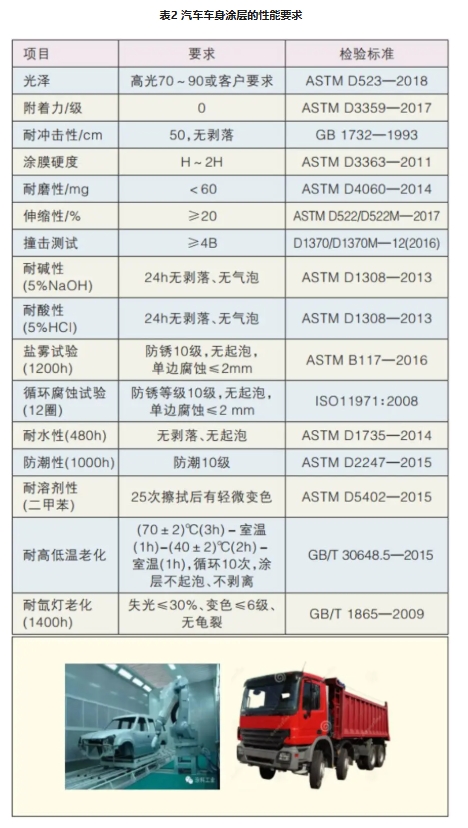 据报道阿克苏诺贝尔生产的Interpon超耐候聚酯粉末色漆在佛罗里达曝晒60多个月后,保光率大于80%,并已为TOYOTA、HONDA、AUDI、PSA、FORD等汽车生产公司所采用,具有与传统水性色漆涂料相类似的外观,汽车车身粉末涂装性能要求如表2所示。