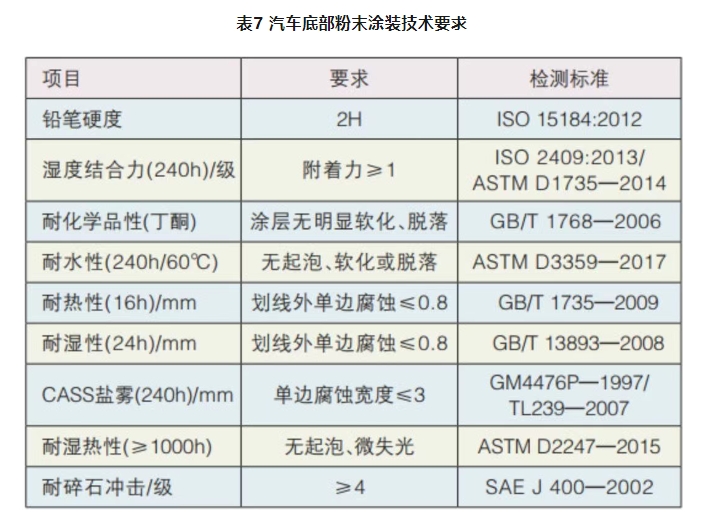 汽车底部涂装主要选用环氧体系和聚氨酯体系。表7列出了汽车底部粉末涂装技术要求。