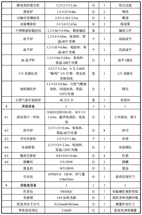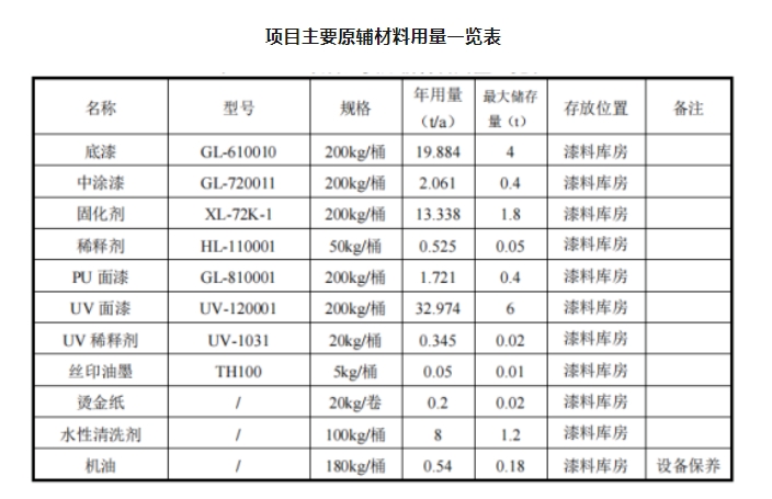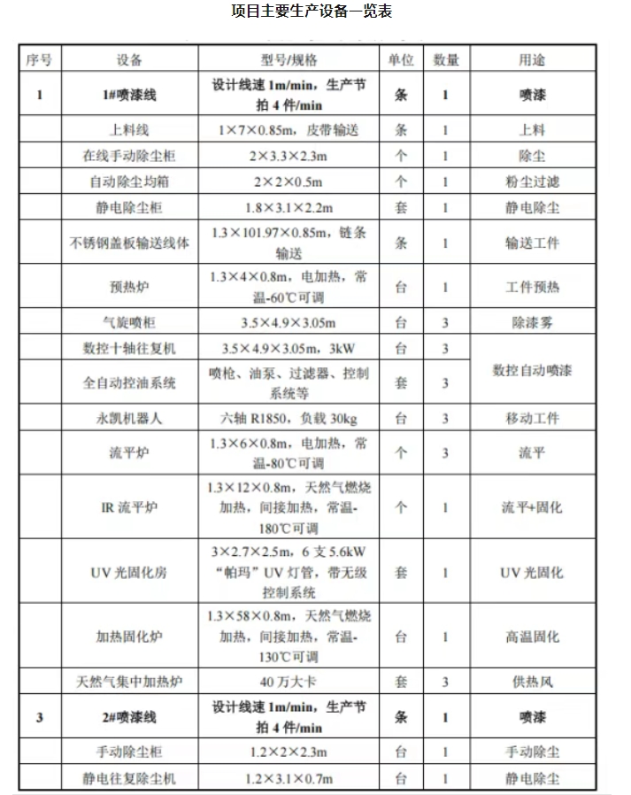 在喷漆工艺方面,该项目采用了UV工艺和PU工艺。这两种工艺在喷涂底漆或中涂漆时使用相同材料,仅面漆有所不同。具体而言,汽车件和摩配件喷涂UV面漆,家电件则喷涂PU面漆。