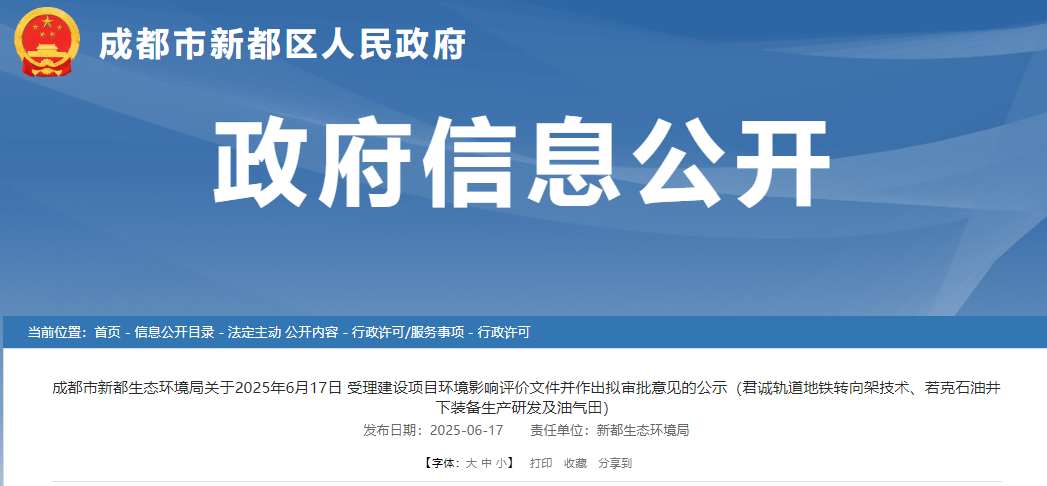 近日,成都市新都区人民政府发布关于2025年6月17日受理建设项目环境影响评价文件并作出拟审批意见的公示(君诚轨道地铁转向架技术、若克石油井下装备生产研发及油气田)。