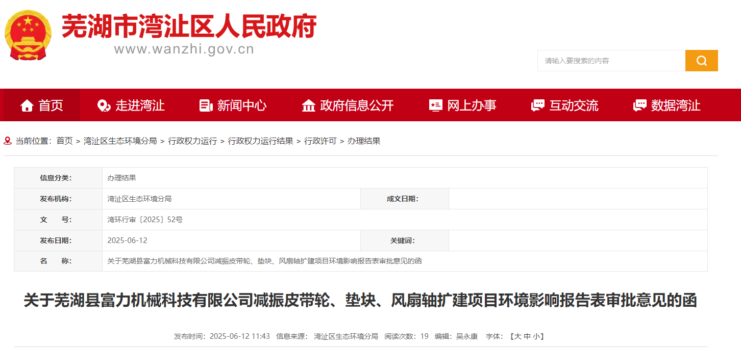 近日,湾沚区生态环境分局发布关于芜湖县富力机械科技有限公司减振皮带轮、垫块、风扇轴扩建项目环境影响报告表审批意见的函。