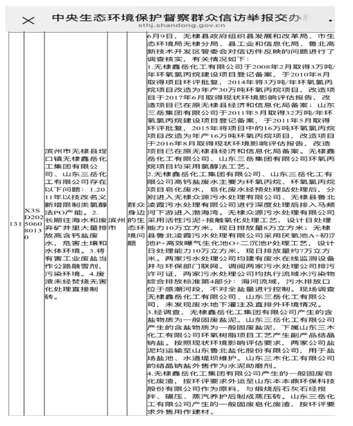 2025年5月27日,中央第三生态环境保护督察组进驻山东后,接到群众举报无棣鑫岳、山东三岳两家公司存在借改造之名违规新建限制类氯醇法工艺的环氧丙烷、环氧氯丙烷产能,长期违规排放高含钙盐废水、将有害工业废盐当作公路融雪剂和废渣未经焚烧无害化处理直接制砖等违规情况。对于群众举报情况,山东省生态环境厅在6月18日第十三批“中央生态环境保护督察群众信访举报交办和边督边改公开情况一览表”中予以通告并回复。