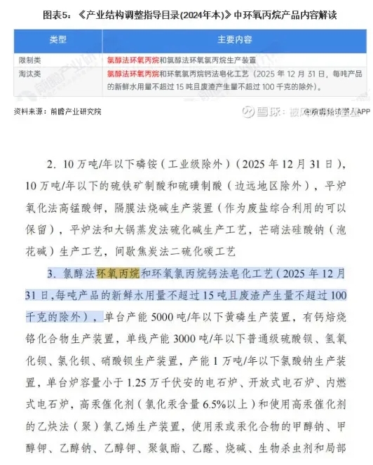 在《产业结构调整指导目录(2024年本)》中将“氯醇法环氧丙烷/环氧氯丙烷钙法皂化工艺(2025年12月31日,每吨产品的新鲜水用量不超过15吨且废渣产生量不超过100千克的除外)”列为淘汰类。