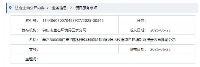 近日,佛山市生态环境局三水分局发布年产8000吨门窗铝型材装饰料喷涂除油线技术改造项目环境影响报告表审批前公示。