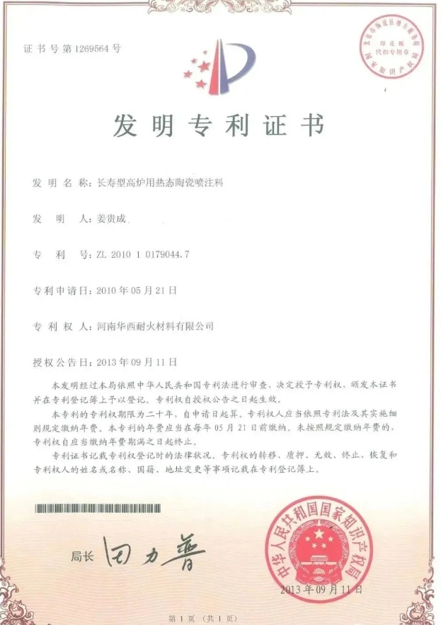 (1)华西科技湿法喷注造衬技术利用和北京科技大学等院校共同研究开发专利高炉喷注物料。该专利物料: