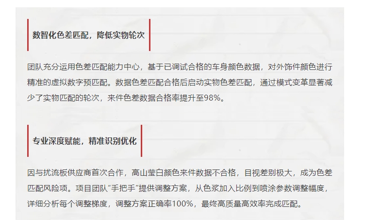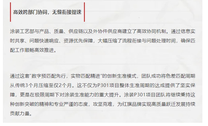 在红旗品牌加速发展的关键时期,P301项目作为首个生准周期压缩至10个月以内的标杆性短周期项目,对各个环节提出了极致效率要求。作为涂装生准阶段的核心环节,色差匹配工作面临前所未有的周期挑战。P301项目团队打破常规,创新采取数智化色差匹配、专业深度赋能、高效跨部门协同三大核心举措,向传统周期3个月发起挑战。 (来源:一汽工程人涂装工艺部)