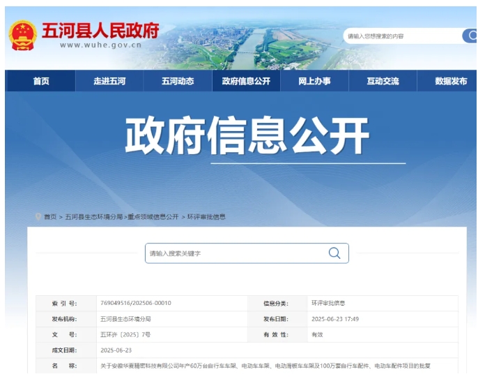 你公司报送的《安徽华夏精密科技有限公司年产60万台自行车车架、电动车车架、电动滑板车车架及100万套自行车配件、电动车配件项目环境影响报告表》(以下简称《报告表》,项目代码2405-340322-04-05-115345)收悉。经认真研究,现批复如下: