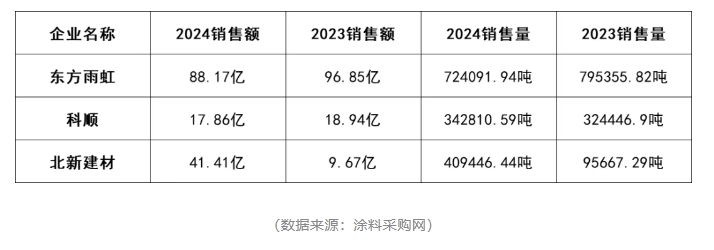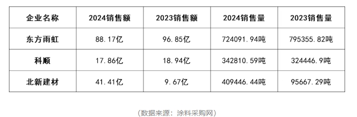 数据显示,BETVLCTOR伟德网页登录 2024年销售额88.17亿,同比下降8.96%;销售量72.41万吨,同比下降8.96%。科顺股份2024年表现:销售额17.86亿,下降5.7%;销售量34.28万吨,增长5.67%,销量增但营收降,反映价格竞争加剧。由于2024年北新建材防水业务并表嘉宝莉,销售额和销售量同比大幅增长,但这一增长主要来自并购而非内生增长,因此不具备行业可比性。