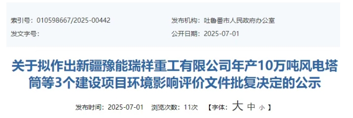近日,吐鲁番市生态环境局发布关于拟作出新疆豫能瑞祥重工有限公司年产10万吨风电塔筒等3个建设项目环境影响评价文件批复决定的公示。
