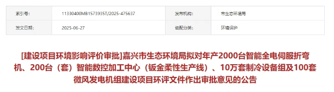 近日,嘉兴市生态环境局发布拟对年产2000台智能全电伺服折弯机、200台(套)智能数控加工中心(钣金柔性生产线)、10万套制冷设备组及100套微风发电机组建设项目环评文件作出审批意见的公告。