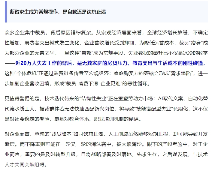 今年以来,国内和海外的多家知名企业都进行了不同规模的裁员,涉及科技、零售、物流、运输等多个行业领域,裁员人数更是动辄上千,仅2025年以来的裁员就接近了20万人。