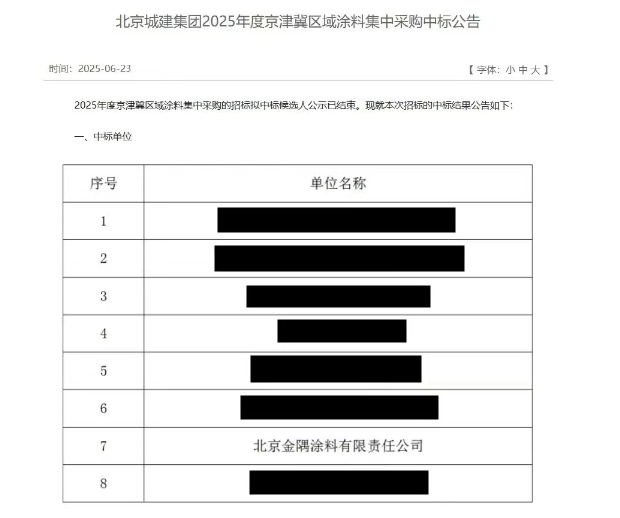 近日,北京城建集团正式对外发布了2025年度京津冀区域涂料集中采购项目的中标公告。在这场汇聚了国内外众多涂料行业佼佼者的激烈角逐中,北京金隅涂料有限责任公司凭借其卓越的技术创新能力、全面且精细化的产品体系,以及在业界树立起的良好品牌口碑,在这次群雄逐鹿的过程中脱颖而出,一举中标北京城建集团2025年度京津冀区域的涂料集中采购项目。