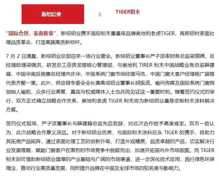 值得关注的是,借助老虎粉末的国际品牌影响力,新绍的产品在开拓海外市场时更具竞争力。作为门窗产业链上游的核心铝材企业,新绍与国际化粉末涂料技术引领者 TIGER 的战略合作,不仅为双方发展注入新动能,更为整个门窗产业链的优化升级提供强大助力。