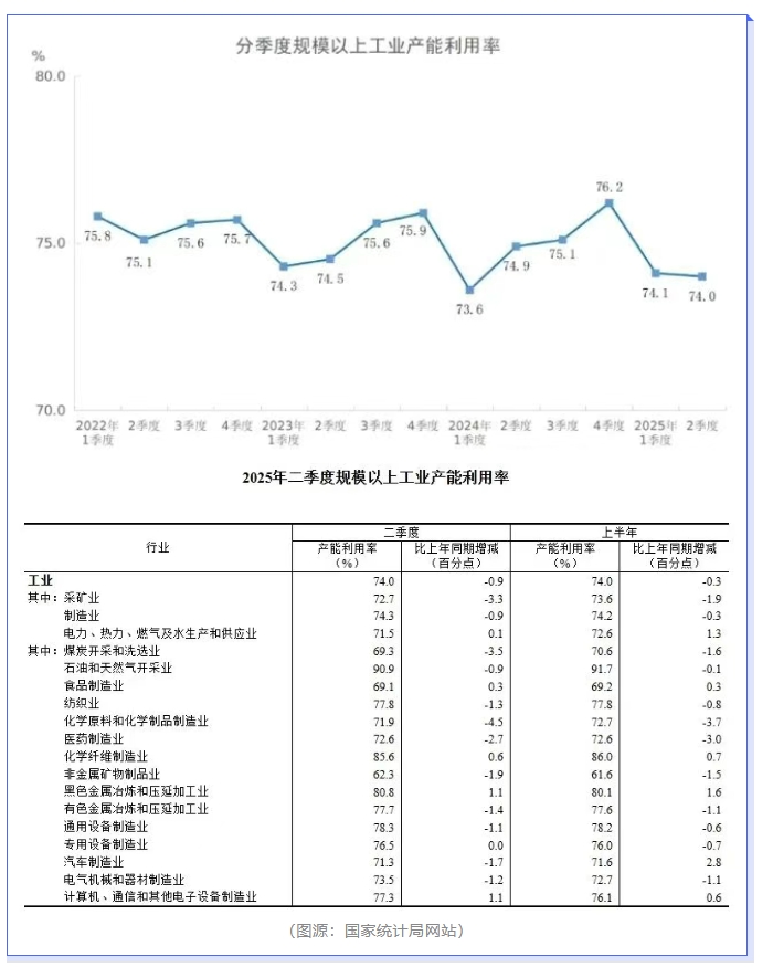 近日,国家统计局网站发布数据,2025年二季度,全国规模以上工业产能利用率为74.0%,比上季度下降0.1个百分点,比上年同期下降0.9个百分点。与此同时,汽车、钢铁、光伏、化工、水泥等多个行业产能利用率急剧下滑,部分已经跌至20%左右,大量产能被“荒废”。
